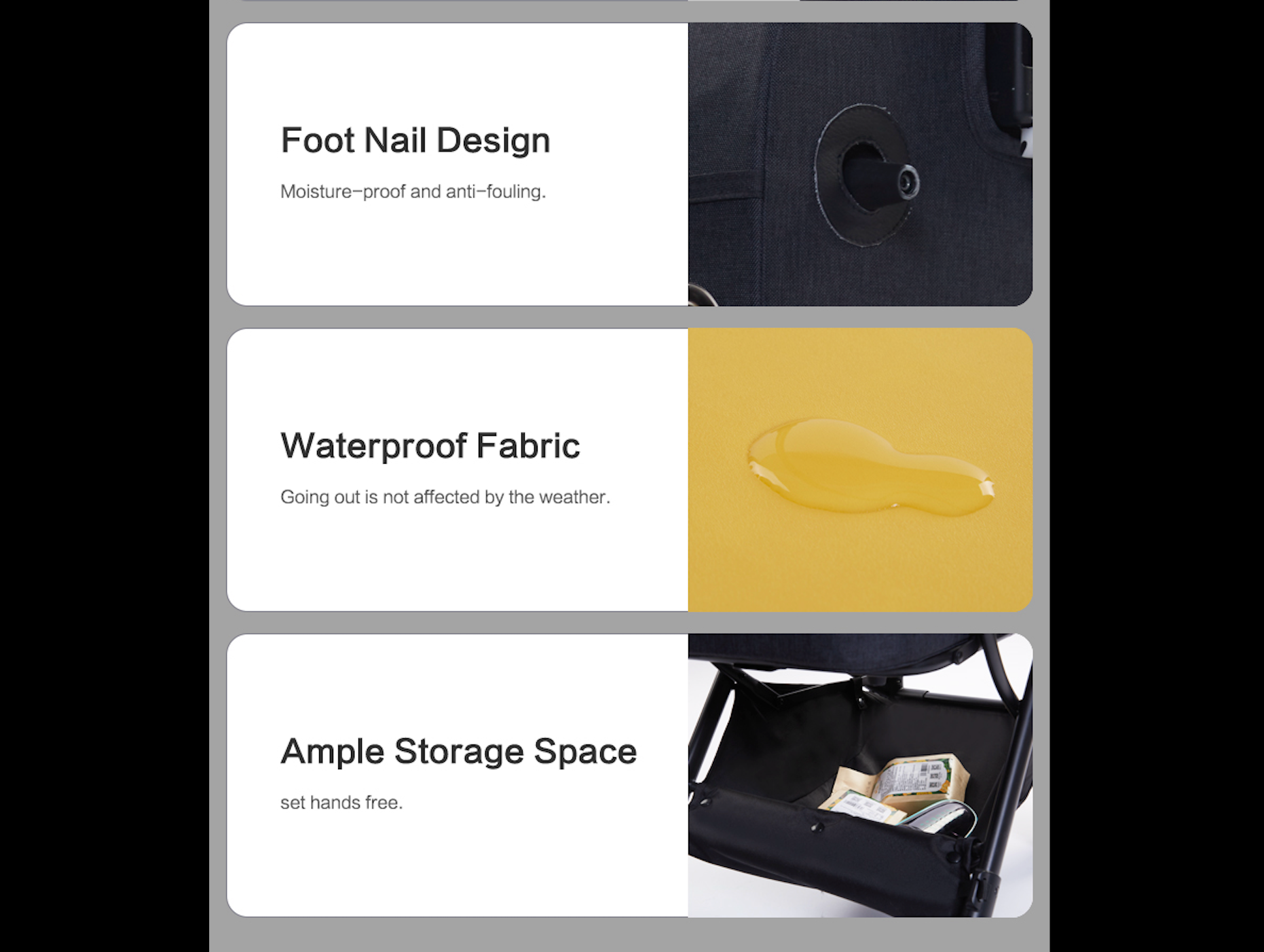 Thanks to its folding design, you can quickly fold the stroller into a compact size, making it incredibly portable and easy to store when not in use. And there are 2 storage pockets to keep travel essentials within easy reach.
