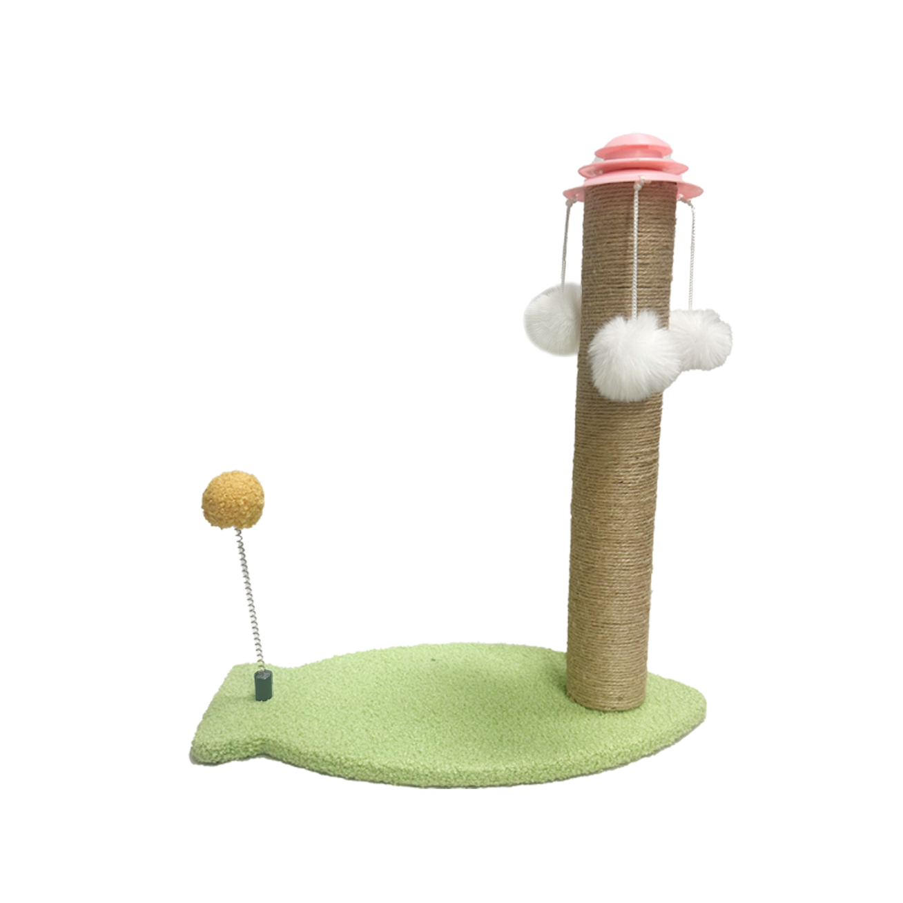 Keep your feline friend entertained with this playful cat scratching post! Featuring a sturdy sisal-wrapped pole for healthy claw maintenance, dangling fluffy pom-poms for endless swatting fun, and a spring-mounted ball for extra playtime excitement — all set on a soft, leaf-shaped base that blends into any home décor.